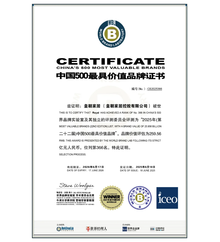 此次再度荣登中国500最具价值品牌榜单,不仅表明了全球专业评审专家对皇朝品牌的充分肯定,更彰显了其在激烈市场竞争中强大的发展韧性与创新活力。