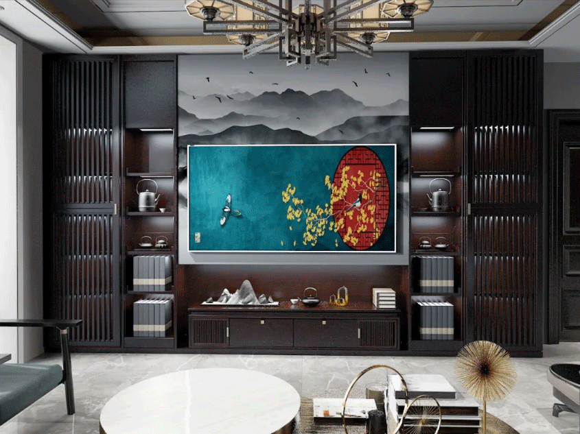 柜体谨遵对称之美,沿用轴对称建筑美学,格栅元素让室内尺度更立体,造型与细节处处尽显中式韵味。