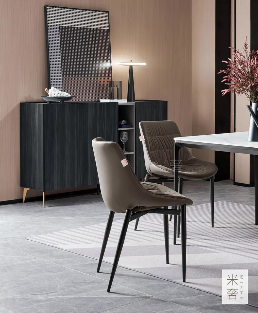 大气之中不失美感,流畅的纹理游走在岩板餐台上,营造出轻奢优雅的时尚氛围。而餐椅则采用科技布面料,舒适亲肤,丝滑细腻,辅以弧形椅背,打造出轻松舒适的用餐环境。