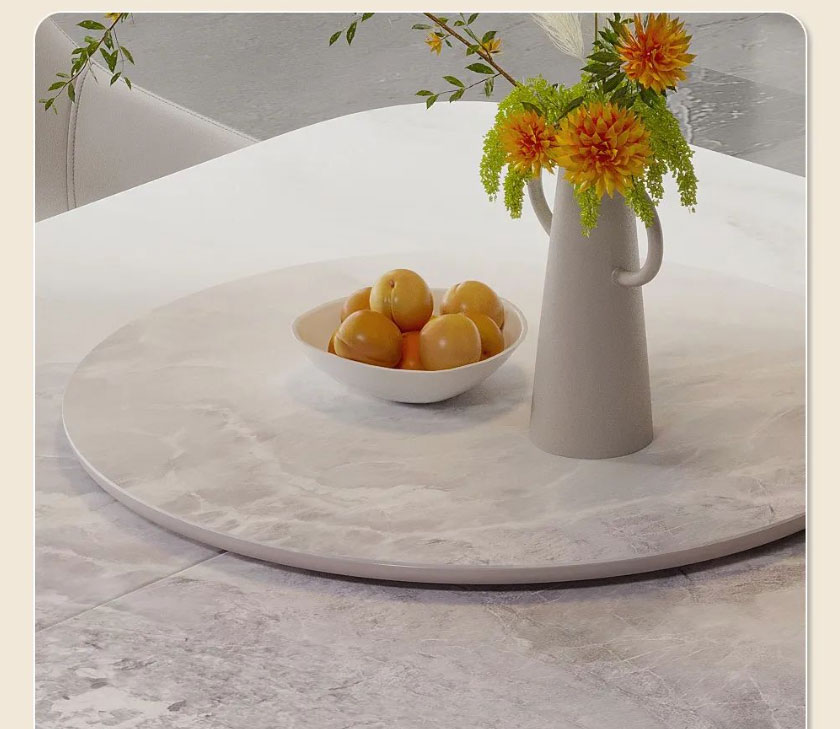 台面选用喜马拉雅彩晶石,天然纹理,诗意优雅,边缘还贴心地做了圆角处理;外嵌360°旋转圆盘,转动不卡顿、无噪音;餐桌采用木质中柱,低调内敛的朴质感中和了石材的清冷,上窄下宽的梯形设计既能稳稳托住台面,又给底部留足了活动空间,做到入座不挡腿。配套的米奢餐椅,以环抱柔软靠背和宽大海绵座包,带来更舒适的落座体验,让你在用餐时更从容惬意。